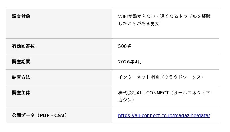 通信インフラ事業と地域振興事業を手掛ける株式会社ALL CONNECT(代表取締役社長:岩井宏太・本社:福井県福井市)が運営する通信メディア「オールコネクトマガジン(https://all-connect.co.jp/magazine/)」は、WiFi利用者500人を対象に「WiFiが繋がらない」トラブルに関する実態調査を行いました。