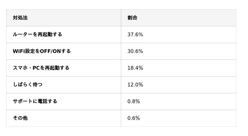 上位3つの対処法はいずれも「とりあえず再起動する」というアプローチであり、根本原因に基づいた対処を行えているユーザーは少数であることが読み取れます。一方で、「サポートに電話する」はわずか0.8%にとどまっており、トラブル時にサポートを頼る人がほとんどいないことも注目すべき結果です。