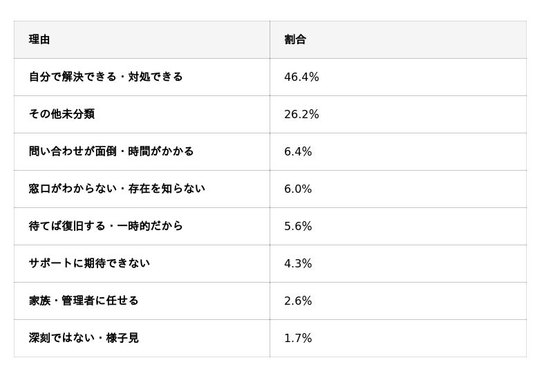 ・サポートセンター未利用者が46.6%と最多で、「面倒」「期待できない」という理由も