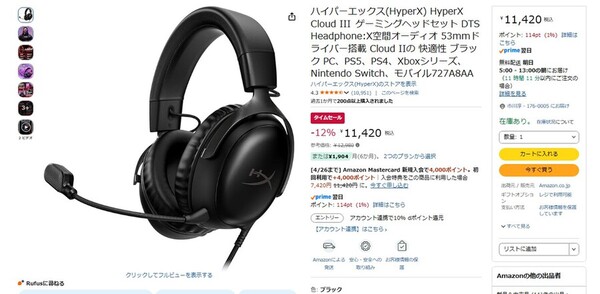 Amazon.co.jpにて、HyperXの有線ゲーミングヘッドセット「HyperX Cloud III」が販売中だ。参考価格は1万2980円だが、タイムセールにより12%オフの1万1420円で購入できる(4月21日時点)。