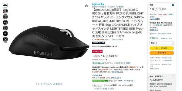 Amazon.co.jpにて、Logicool Gのワイヤレスゲーミングマウス「Logicool G PRO X SUPERLIGHT 2」が販売中だ。過去価格は2万5157円だが、タイムセールにより25%オフの1万8980円で購入できる。