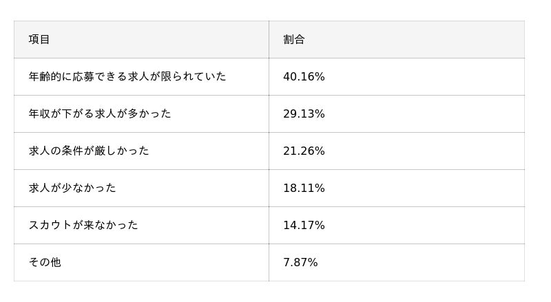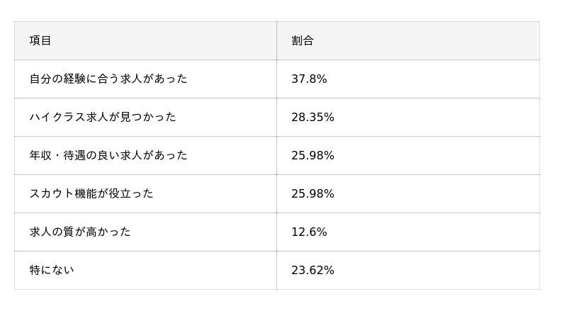 - 満足度は「満足以上で58.3%」と一定水準を維持。評価ポイントは「自分の経験に合う求人」(37.8%)やハイクラス求人(28.4%)で、これまでのキャリアを活かせる案件へのニーズが強い。一方で不満点は「年齢的に応募できる求人が限られる」(40.2%)が最多で、年収ダウン求人の多さ(29.1%)や条件の厳しさ(21.3%)も目立つ。