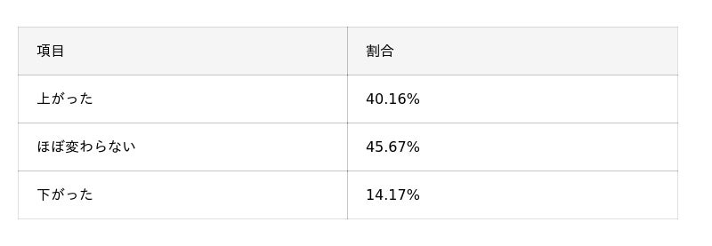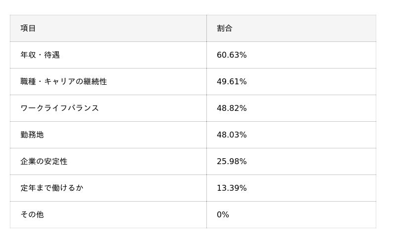 - 転職時に重視した点は「年収・待遇」(60.6%)が圧倒的トップで、次いでキャリアの継続性(49.6%)、ワークライフバランス(48.8%)。また、年収は「上がった」40.2%に対し「下がった」14.2%と、転職によって収入が改善した人も一定数いることがわかった。