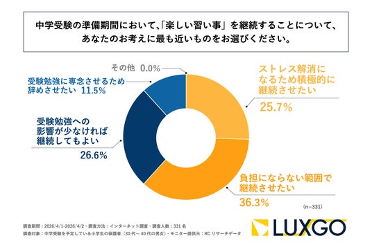 LUXGO株式会社(ルクスゴー株式会社、本社:東京都台東区、代表取締役:中川 慶悟)が運営する「Kidsプログラミングラボ 秋葉原教室」は、中学受験を予定している小学生の保護者(30代~40代の男女)を対象に「中学受験家庭の新学年ストレスに関する調査」を実施しました。この調査から、中学受験を予定している小学生の保護者が感じる、子どもの新学年スタート時の精神的・身体的な負担の実態や、そのストレスが学習に与える影響などが明らかになりました。