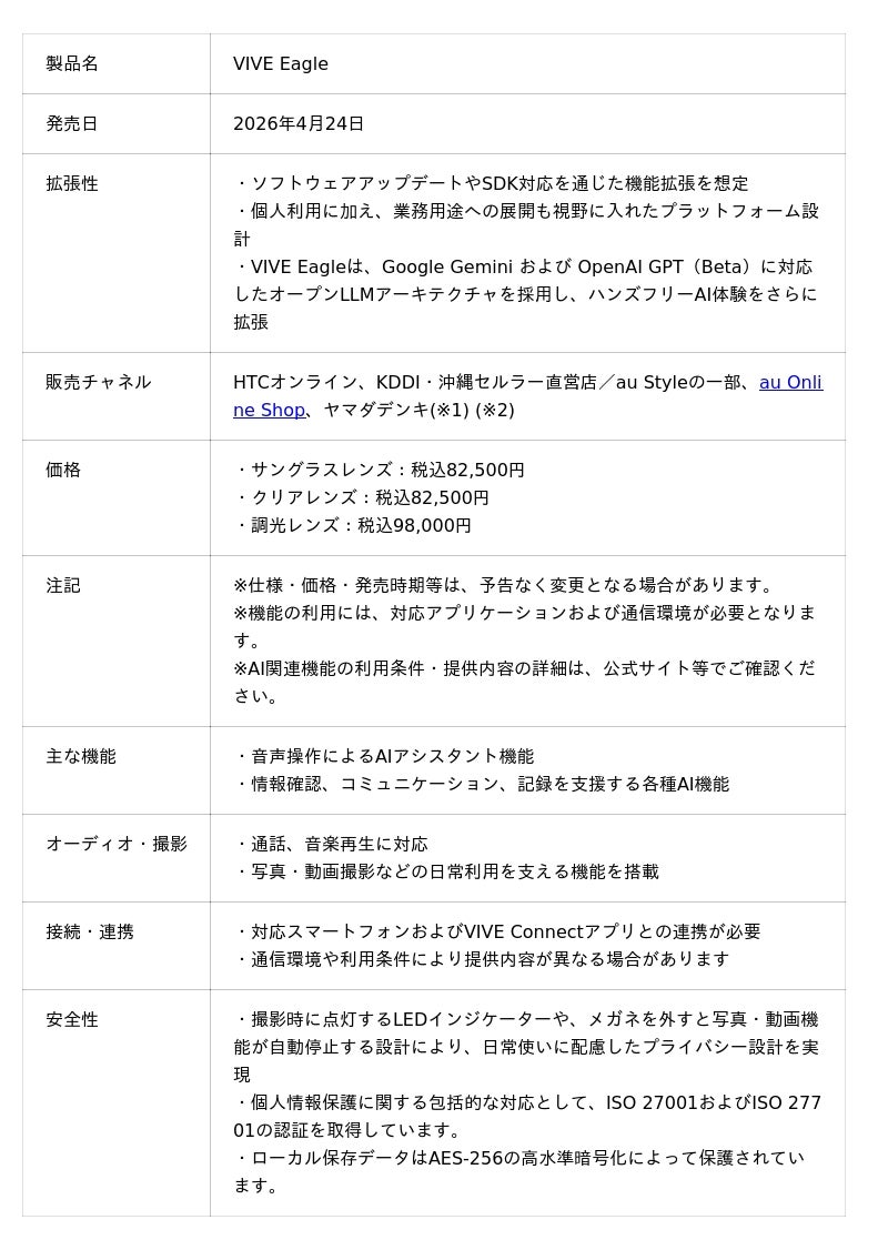 HTC NIPPON株式会社は、日常生活の中でAIをより自然かつ実用的に活用できる新しいデバイスとして、AIグラス「VIVE Eagle」を日本国内で2026年4月24日より販売開始いたします。