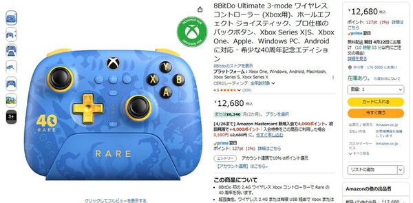 Amazon.co.jpにて、Xbox・PC対応ワイヤレスコントローラー「8BitDo Ultimate 3-mode(Rare 40周年記念エディション)」が販売中だ。価格は1万2680円。