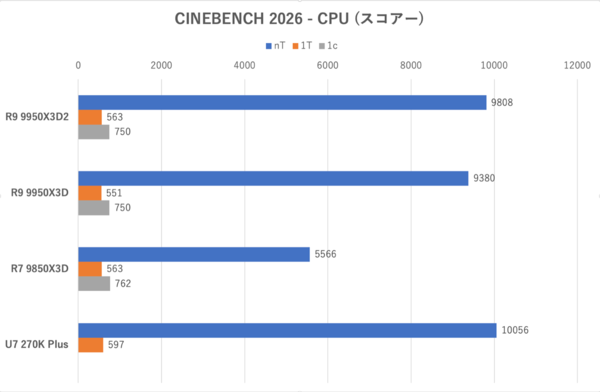 Ryzen 9 9950X3D2のスコアーは9950X3Dよりもやや上昇。TDPが170Wから200Wへ増加しているものの、CINEBENCH 2026ではほぼ影響がない範囲である。ただ絶対的なスコアートップはCore Ultra 7 270K Plusとなった。これはコアの性能云々というよりも、Core Ultra 7 270K Plusがより高クロックメモリー(DDR5-7200)をサポートしているおかげとも言える。