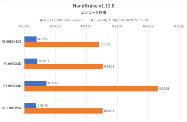 続いては消費電力検証だが、消費電力計測に使用したテストの結果を先にチェックしよう。動画エンコーダー「HandBrake」を用い、約3分の4K動画(60fps)をプリセットの「Super HQ 1080p30 Surround」ならびに「Super HQ 2160p60 4K HEVC Surround」を利用してエンコードする時間を計測した。