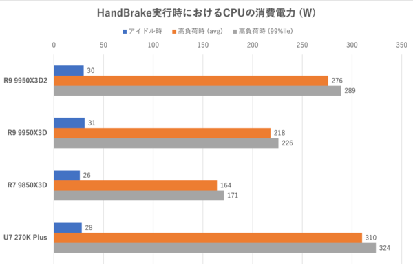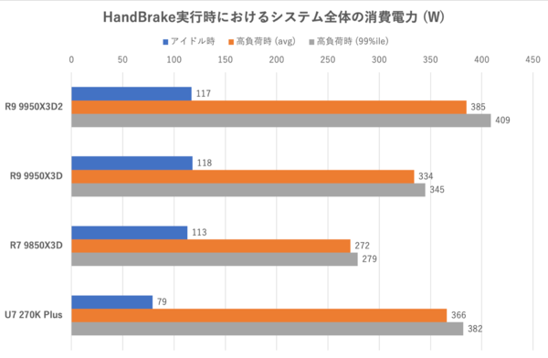 Ryzen 9 9950X3D2のTDPが170Wから200Wへ引き上げられたことによる影響は大きい。Ryzen 9 9950X3Dに対しシステム全体だと約26%、CPU単体だと約15%消費電力が増大している。CPU単体でのトップはCore Ultra 7 270K Plusだが、システム全体で見るとRyzen 9 9950X3D2の消費電力が大きい。システム全体の消費電力の増大に関しては今回レビュー用に貸与されたマザーがX870E(チップセットが2つ)かつ装備山盛りのハイエンドのマザーであることも影響しているだろう。