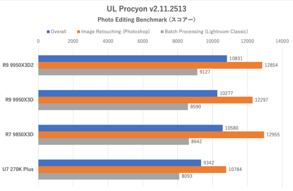 ここでのトップはRyzen 7 9850X3D。Ryzen 9 9950X3D2は9950X3Dよりもわずかに高スコアーだが、Ryzen 7 9850X3Dを大きく上回るには至らなかった。唯一注目したいのはLightroom Classicを利用するBatch Processingテスト。Image Retouchingはほぼシングルコア勝負なのに対し、Batch Processingテストはある程度の並列度が求められるので、コア数が多くTDPの上限が引き上げられたRyzen 9 9950X3D2が優勢になったと考えられる。