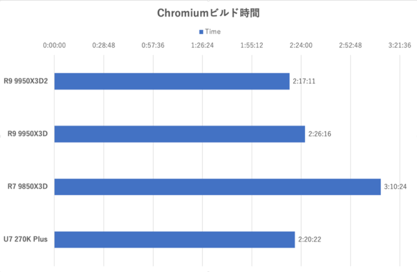 傾向としてはBlender Benchmarkが近いだろうか。コア数が少ないRyzen 7 9850X3Dが最もビルドに時間がかかり、コア数の多いRyzen 9 9950X3D2や9950X3Dはより高速だが、コア数が倍になったわりには劇的に高速化されたとは言い難い。Ryzen 9 9950X3D2と9950X3Dを比較した場合、3D V-Cacheが増えたから高速になったというよりも、TDPなどの電力制限系が引き上げられたために処理時間が短縮したという印象が強い。