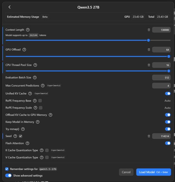 LM Studioにおける設定。GPU Offloadは最大と最小の2パターンを用意。CPU Thread Pool SizeはCPUの物理コア数に合わせ調整。Context LengthはCPUのみで実行した際に23GB程度使用するよう調整している。さらに言えばシードはすべて同じ値である