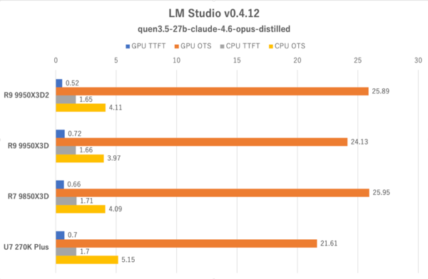 次は「LM Studio」によるLLMの推論処理のパフォーマンスを比較する。学習モデルは「qwen3.5-27b-claude-4.6-opus-distilled」を利用し、以下のようなプロンプトを入力。最初のトークンまでの時間(TTFT:Time To First Token)とトークン出力スピード(OTS:Output Token Speed)を比較する。GPU Offloadを最大(GPUに全振り)と最少(CPUに全振り)に設定し、違いが出るかもチェックする。