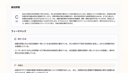 ロープレ実施後にAIが自動で生成する評価レポートでは、設定されたすべての評価基準に基づく総合点・総評と、評価基準ごとの評点・コメントが表示されます。