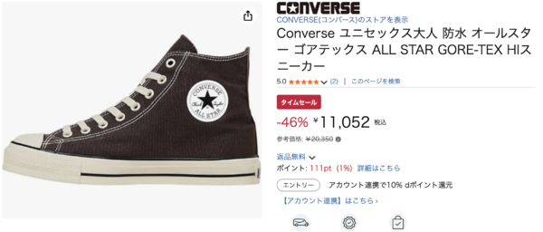 コンバースの名作、「ALL STAR」を雨の日でも履きたい。それなら、コンバースのALL STAR GORE-TEX HI(エボニーブラウン)。Amazonのタイムセールで46%OFFの11,052円で販売されています(4月22日現在)。