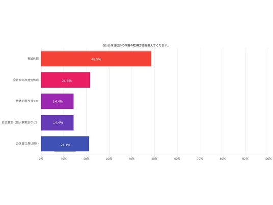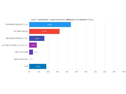 一方で「公休日以外は無い」と回答した人も21.1%存在し、その理由としては「特に必要性を感じていない」(44.0%)、「業務に支障が出る」(32.0%)などが挙げられました。