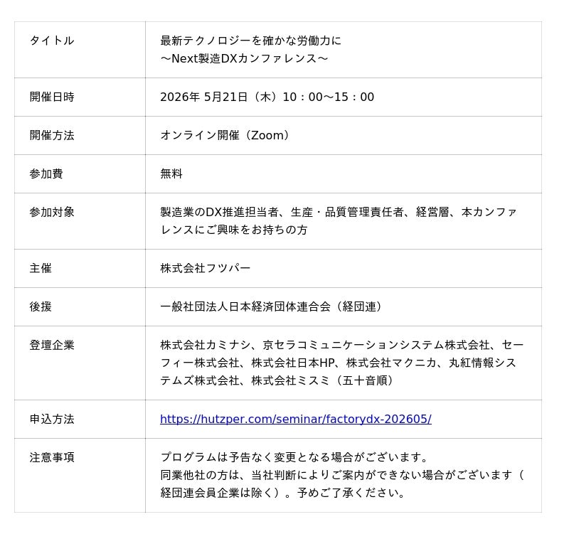 株式会社フツパー(本社:大阪府大阪市、代表取締役社長CEO:大西 洋、以下「当社」)は、2026年5月21日(木)に「最新テクノロジーを確かな労働力に~Next製造DXカンファレンス~」を開催いたします。
