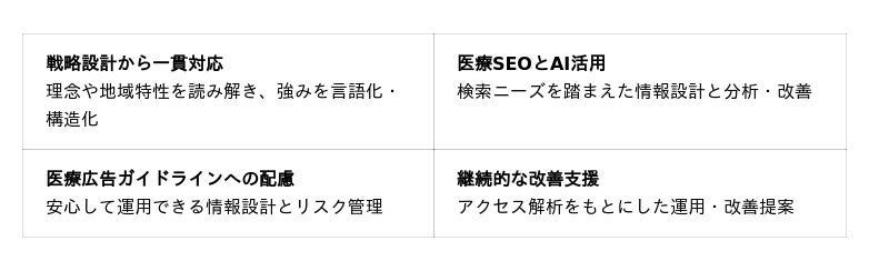 Web制作と一体的に支援することで、より実効性の高い集患施策へとつなげることができます。