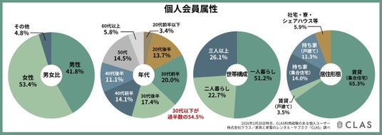 男女比はほぼ半々(男性41.8%、女性53.4%)と性別を問わず支持されるなか、ライフステージの変化が活発な30代以下が54.5%と過半数を占め、さらに「一人暮らし(51.2%)」や「賃貸住まい(68.8%)」といった柔軟な暮らし方を選ぶ層を中心に、必要な時に必要な家具・家電を返却・交換しながら利用するスタイルが現代のスタンダードとして定着しています。