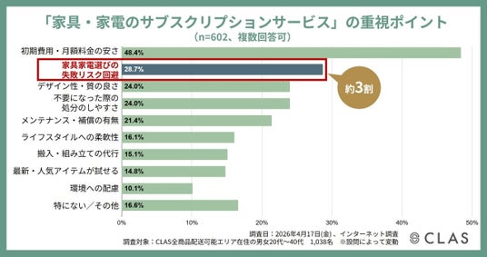 サービスを認知している層(n=602)に対し、利用・検討時に重視するポイント(複数回答可)を聞いたところ、「初期費用・月額料金の安さ(購入より手軽に始めたい)(48.4%)」に次いで、約3割が「家具家電選びの失敗リスク回避(試してから購入を決めたい)(28.7%)」と回答しました。