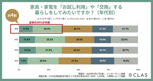 この節目に、自社で展開する家具と家電のレンタル・サブスク『CLAS』の全商品配送可能エリア(東京都、神奈川県、埼玉県、千葉県、大阪府、京都府、兵庫県 ※1)にお住まいの男女20代~40代を対象とした「家具・家電の利用に関する意識調査(n=1,038)」を実施いたしました。