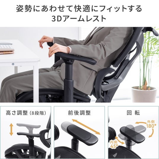 姿勢にあわせて快適にフィットする3Dアームレスト