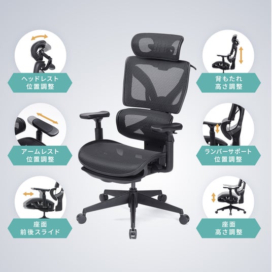 座面・ヘッドレスト・背もたれ・肘掛けなど多数の調整機能を搭載し、座る方の体格に合わせて細かい調整が可能。まるでオーダーメイドのような極上の座り心地を実現します。