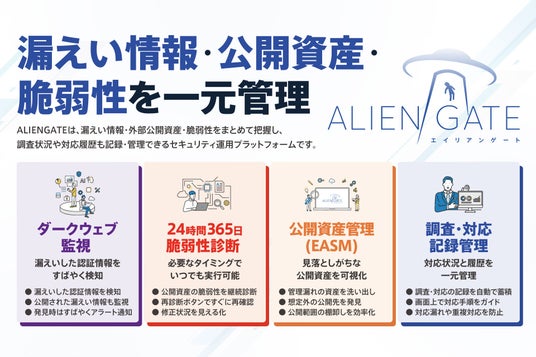 株式会社CyberCrew(本社:東京都千代田区、代表取締役:香川 健志、以下「CyberCrew」)は、日本初※のAttack Chain Intelligence(ACI)プラットフォーム「ALIENGATE」の「Basicプラン」を対象に、2026年5月末まで無料で利用できるキャンペーンを先着300社限定で開始しました。あわせて、導入を検討する企業向けに、初期設定や基本操作を解説する無料オンラインセミナーを2026年4月から5月にかけて開催します。認証情報の漏えいやシステムの脆弱性を継続的に把握し、被害が顕在化する前の対策を支援します。