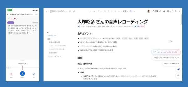 例えば、Web会議では、AIがよくある「振り返る」「まとめる」作業を効率化してくれる。会議の内容はリアルタイムで文字起こしされ、聞き逃したトピックをいつでもキャッチアップ可能に。会議が終われば、議事録が自動作成され、社内外の出席者への共有も楽になる。