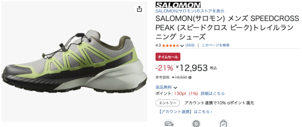 サロモンのSPEEDCROSS PEAKが、Amazonのタイムセールで21%OFFの12,953円で販売されています(4月22日現在)。