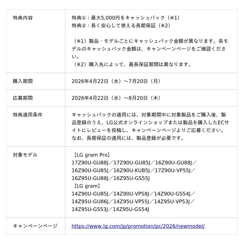 LGエレクトロニクス・ジャパン株式会社(代表取締役:孫 成周(ソン・ソンジュウ) 本社:東京都中央区)は、モバイルノートパソコンシリーズ「LG gram」のご購入とレビュー投稿で最大5,000円をキャッシュバックする『LG gramご購入キャンペーン』を本日2026年4月22日(水)より実施します。