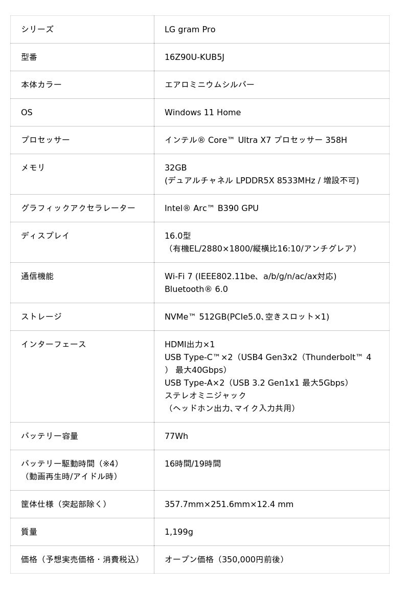 ■LG gram Pro(型番:16Z90U-KUB5J) ※5,000円キャッシュバック対象