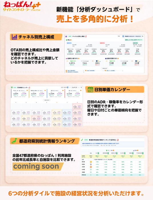 楽天トラベルサービス株式会社(本社:東京都世田谷区、代表取締役社長:高野芳行、以下「楽天トラベルサービス」)が提供する国内導入施設数No.1[*1]のサイトコントローラー「ねっぱん!サイトコントローラー++」(https://www.neppan.com/)は、2026年4月22日(水)より、宿泊施設のデータ活用をさらに強化する新機能「分析ダッシュボード」の提供を開始いたします。