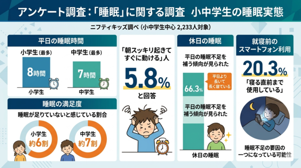 最新の調査によると、小学生の約6割、特に中学生では約7割が「睡眠不足」を感じていることが分かりました。