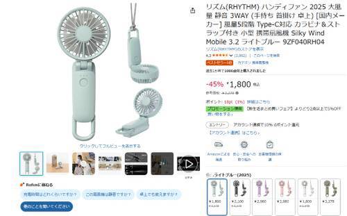 リズムのハンディファン「Silky Wind Mobile 3.2」がAmazonで割引対象。参考価格3,278円のところ、45%オフの1,800円で販売中。
