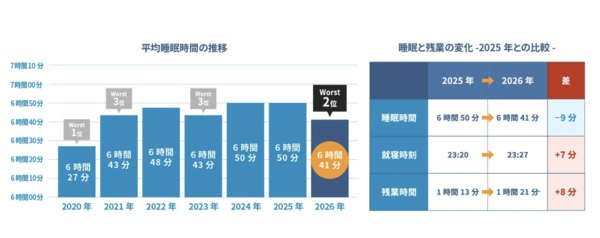 2026年の調査では、有職者の平均睡眠時間は6時間41分となり、前年の6時間50分から減少し、調査開始以降でワースト2位の水準となった。健康維持に必要とされる睡眠時間を下回り、OECD加盟国平均と比較しても短い状態が続いている。