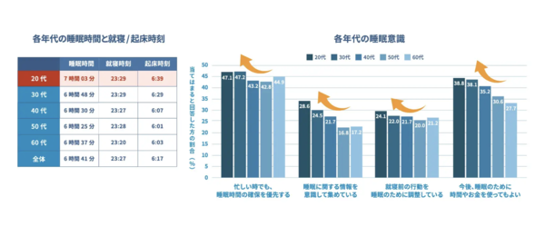 一方、20代は全世代で唯一、平均睡眠時間が7時間を超えた。睡眠時間の確保を優先し、情報収集や就寝前の行動調整、睡眠への投資に積極的であるなど、睡眠に対する意識の高さが特徴として確認された。