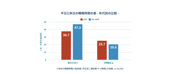 ただし、20代は平日と休日の睡眠時間の差が大きく、週末に2時間以上長く寝る傾向があり、生活リズムが不安定になりやすい課題も見られた。