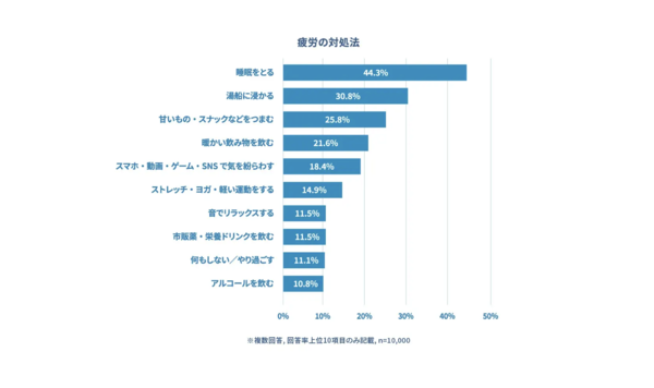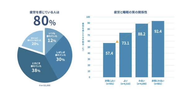 また、直近1か月で疲労を感じた人は全体の約8割にのぼり、疲労の対処法として最も多かったのは「睡眠」であった。睡眠の質が高いほど疲労感が低いという関連も確認されている。