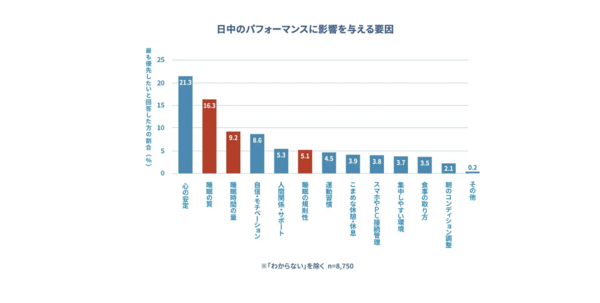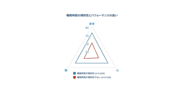 さらに、日中のパフォーマンスに影響する要因として「睡眠の量・質・規則性」の総合要因が最も大きい割合を占め、特に「7〜8時間の睡眠を規則的に確保している層」が最も高いパフォーマンスを示した。