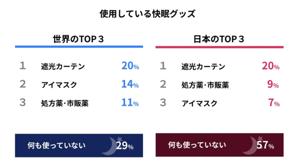 さらに、睡眠改善に向けた行動も遅れており、「睡眠改善ツールを使用していない」と回答した人は57.4%、「睡眠改善の習慣がない」は38.4%で、いずれも世界平均を大きく上回りました。