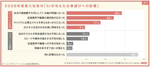 就職活動への影響では「特に影響なし」が36.5%で最多となり、「価値観の明確化」28.2%、「選択肢の拡大」24.1%などが続いた。