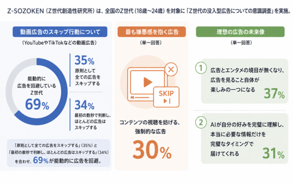YouTubeやTikTokなどの動画広告について調べたとある調査で、Z世代(18歳〜24歳)は「広告を原則すべてスキップする」と「数秒で判断してほぼ飛ばす」が合わせて69%となり、広告を能動的に回避する割合が高い結果となった。