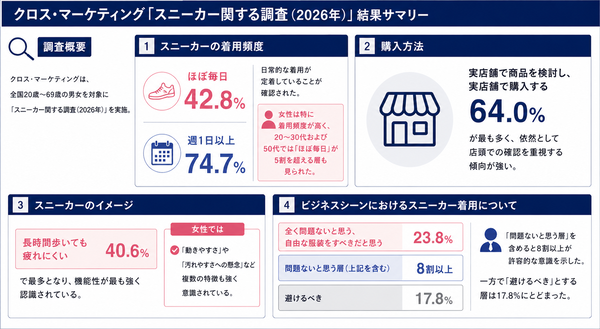 スニーカーはもう、スポーツ用でもカジュアル専用でもなくなったらしい。とある調査によると、全国の20〜69歳男女のうち、ビジネスシーンでもスニーカー着用を「全く問題ない/問題ない」と考える人が、8割を超える結果となった。
