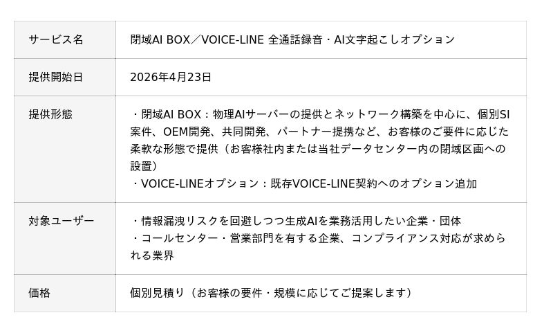 フォースネット株式会社(本社:東京都渋谷区、代表取締役:漆谷 智行、以下「当社」)は、データを外部に送信しない物理AIサーバー「閉域AI BOX」の提供を本日より開始いたします。お客様社内への設置(オンプレミス)と、当社データセンター内の閉域区画への設置のいずれにも対応します。あわせて、第一弾の活用ソリューションとして、当社の0ABJ対応通信サービス「VOICE-LINE」に全通話録音およびAI文字起こし・要約オプションを追加いたしました。