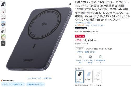 UGREENのモバイルバッテリー「PB580」がAmazonでタイムセール対象。参考価格5,980円のところ、20%オフの4,784円で販売中。