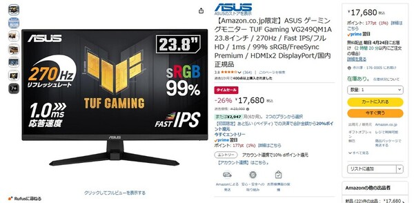 “とにかく速い”を極めた、270Hz×1msのASUS製23.8型フルHDゲーミングディスプレーがタイムセールで1.7万円!
