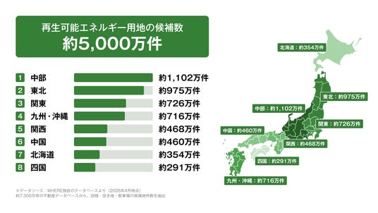 約7,300万件の不動産データベースのうち、約68%の物件が再生可能エネルギー用地の候補になりうるという結果に。特に中部地方や九州・沖縄地方は田畑の割合が多く、特に農地転用のチャンスが大きい地方であることが示唆されます。