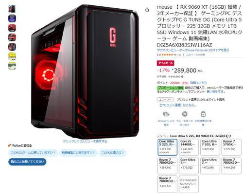 マウスコンピューターのゲーミングデスクトップPC「G TUNE DG(DGI5A6XB83SJW116AZ)」がAmazonでタイムセール対象。参考価格349,800円のところ、17%オフの289,800円で販売中。