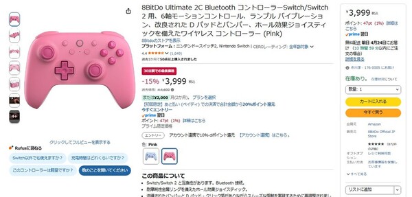Amazon.co.jpにて、8BitDoのNintendo Switch用コントローラー「8BitDo Ultimate 2C」が販売中だ。過去価格は4690円だが、執筆時点では15%オフの3999円で購入できる(4月23日時点)。